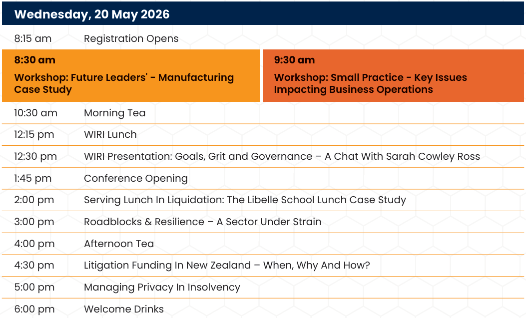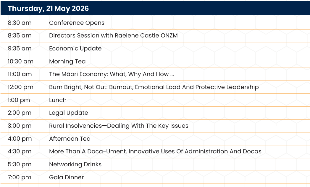 We are delighted to invite you to register for the upcoming 24th Annual Corporate Restructuring Insolvency & Turnaround Conference, the premier conference for accountants, lawyers, licensed insolvency practitioners, financiers and advisors working in our industry in New Zealand.